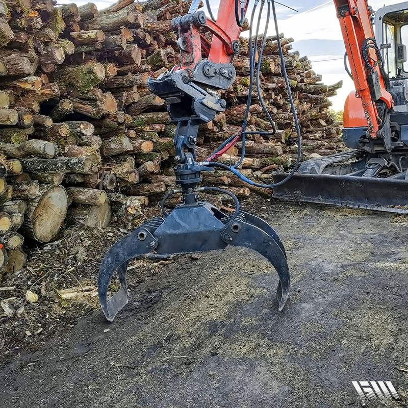Pince de débardage en montage pendulaire pour pelle et grue, d'une capacité de levage de 1000kg.